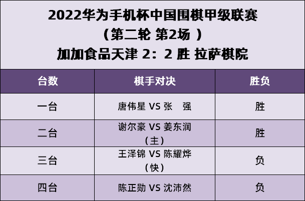 三台比赛,由拉萨棋院队陈耀烨对阵加加食品天津队王泽锦,陈耀华执黑,双方战至217手,黑中盘胜,最终陈耀烨胜王泽锦,拉萨棋院夺得一分。